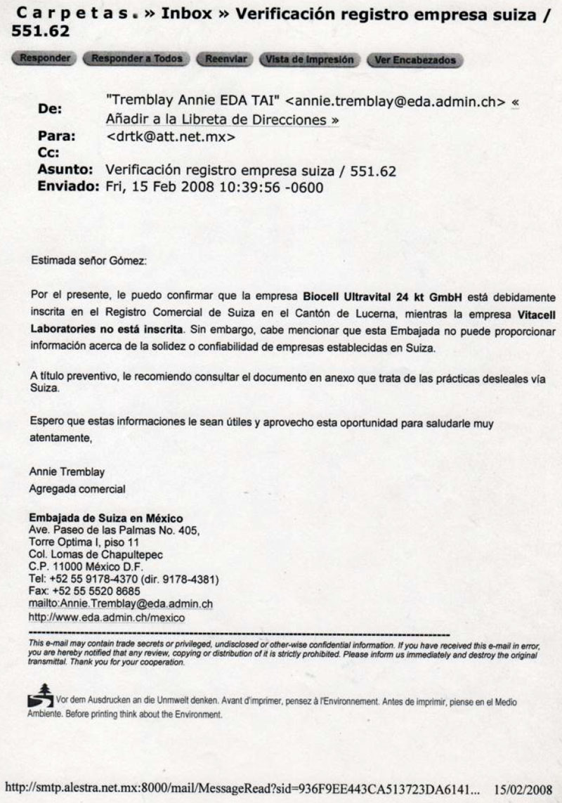 Vitacell Laboratory No Suiza Segun Consul Suizo en Mexico